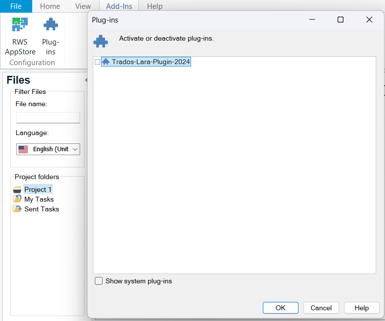IIf this is your first time using Lara in Trados, you’ll need to activate the plugin by going to Add-Ins → Plug-Ins and enabling Trados-Lara-Plugin-2024.