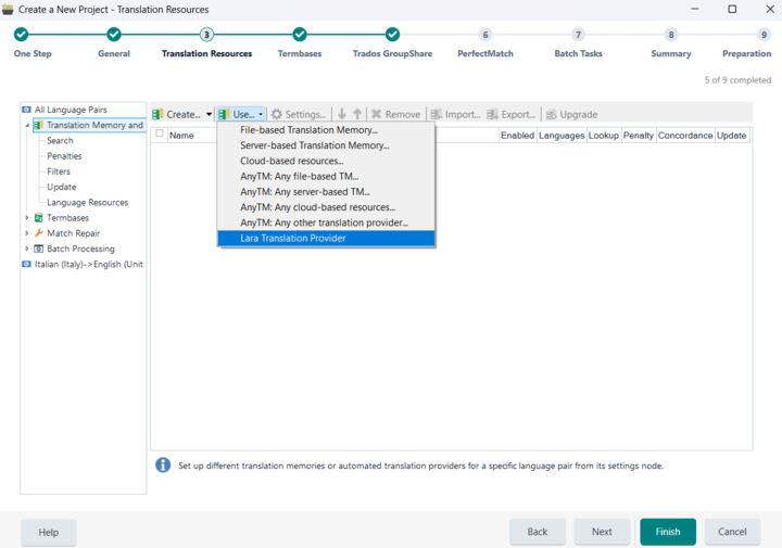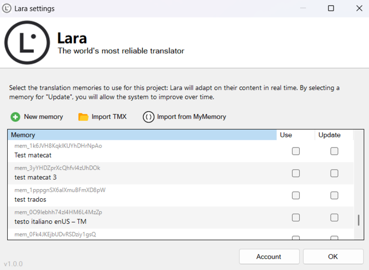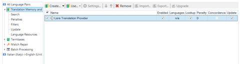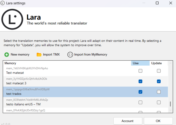 Once you select Lara as your MT provider, a page will open where you can decide which TMs to use in your projects. You can: