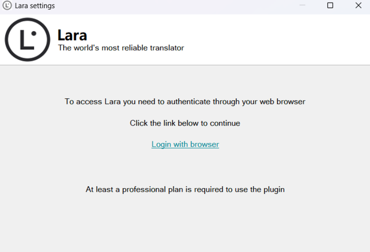 If it’s your first time using the plugin, a pop-up window will appear asking you to log in. You’ll be taken to the login page, where you can sign in with your Lara credentials.